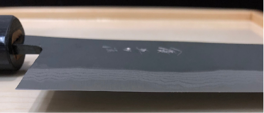 This beautiful traditional hand forged knife is called “Suminagashi” / Damascus print and it’s 3 layers hand forged steel and use Blue Steel No.2 which is high carbon steel for core of the blades.